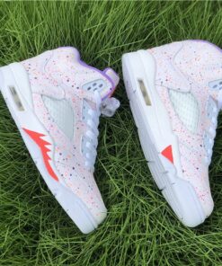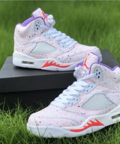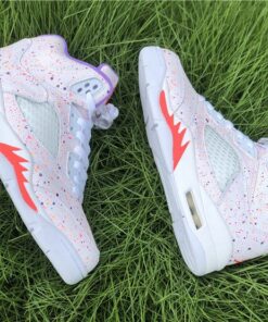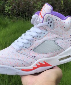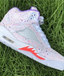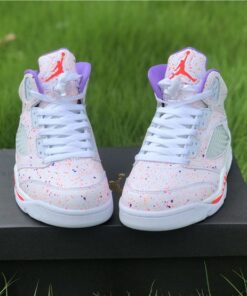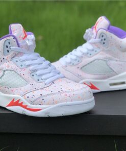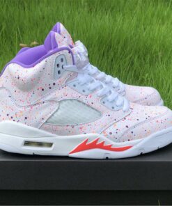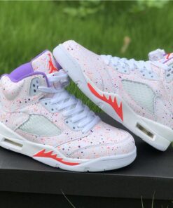 Dressed in a White, Laser Crimson, and Voltage Purple color scheme. This Air Jordan 5 features a White leather base that’s fully covered in a multicolored splatter print. Crimson branding on the tongues and midsole with Purple lining atop a solid White rubber sole completes the design.