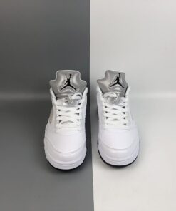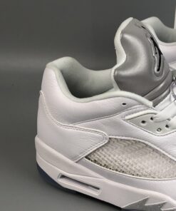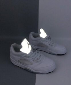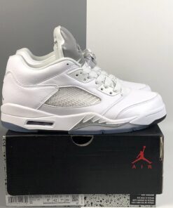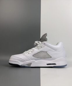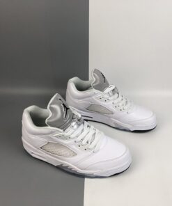 This Air Jordan 5 Low has a lot of similarities to the previous Air Jordan 5 “Metallic Silver” release that is dressed in a White, Black and Wolf Grey color scheme. The shoe features an all-White leather base upper with Black detailing and Wolf Grey accents throughout. Finishing off the look is an icy translucent outsole.