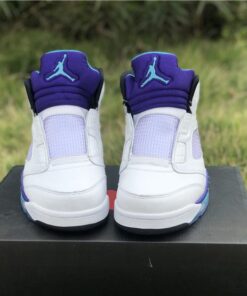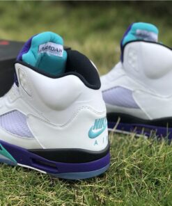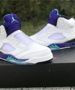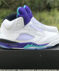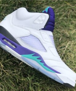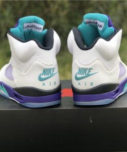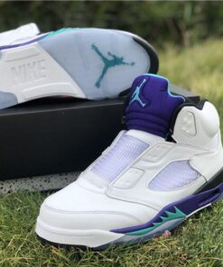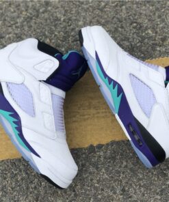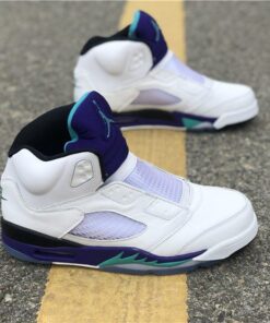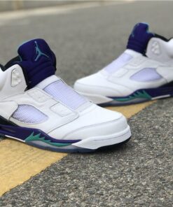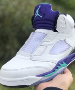 Dressed in a White, Grape Ice, Black, and New Emerald color scheme. This Air Jordan 5 looks exactly like the OG Grapes, but with some added detailing. It includes “West Philadelphia” text underneath the tongue, Nike Air branding on the heels, no laces (sealed lace holes) – as a nod to the way Will Smith wore them, and Fresh Prince inspired insoles.