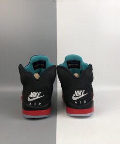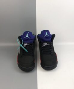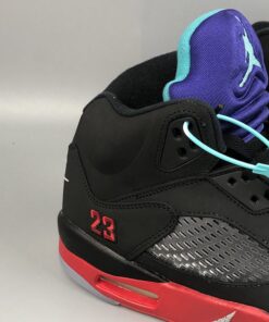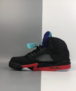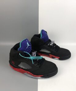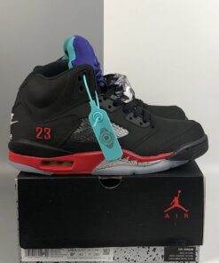 This Air Jordan 5 will be inspired by the original colorways which includes Black Metallic, Grape and Fire Red. They will feature Black across the upper while Grape Ice and New Emerald land on the tongue. Fire Red is placed on the 23 and midsole, Metallic Silver with Black speckled details on the sides. Other highlights will include Nike Air on the heel in White on the heel and a translucent outsole. Unlike previous Top/What The themes, both shoes will feature the same color blocking.