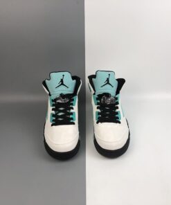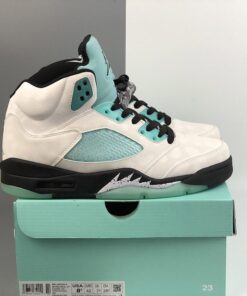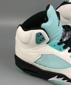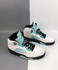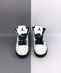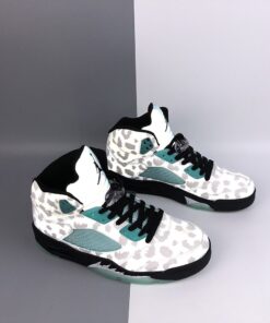 Dressed in a White, Black, and Island Green color scheme. While the Air Jordan 13 comes with croc print, this Air Jordan 5 features a White upper with tonal leopard print similar to the “Snow Leopard” Air Jordan 34 that releases during the same month. Other details include Island Green accents with Black detailing, speckled Metallic Silver on the midsole atop a translucent outsole.