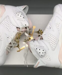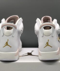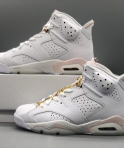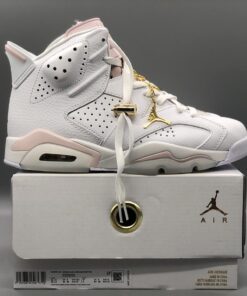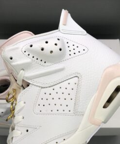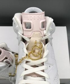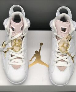 Dressed in a White, Sail, Metallic Gold, and Barely Rose color scheme. Taking inspiration from Gold earrings, this Air Jordan 6 adds interconnected Gold hoops that are attached to the shoe’s lace toggle. Materials on this model include White medium grain tumbled leather with Gold underlays, a semi-gloss lining and a milky-White translucent rubber outsole completes the design.