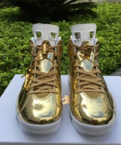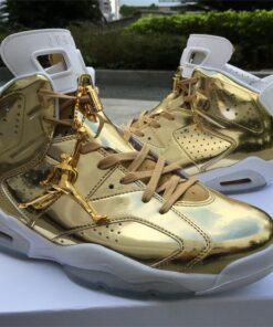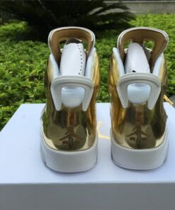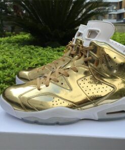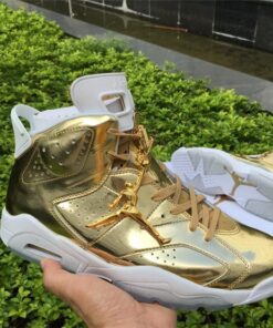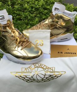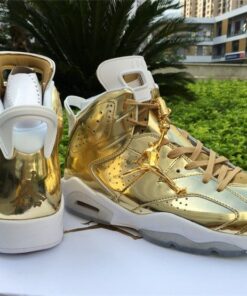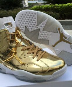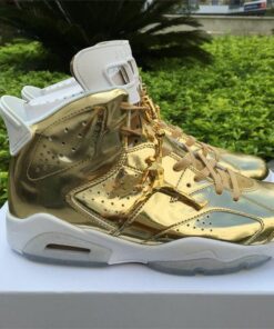 This luxurious-styled Air Jordan 6 features a full patent leather Metallic Gold upper offset by White on the tongue, heel and midsole. A Metallic Gold speckled outsole and oversized Jumpman hangtag added to the luxe theme.