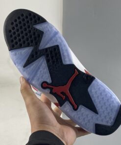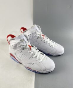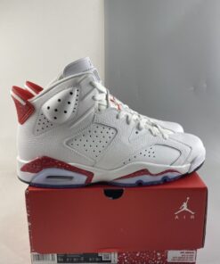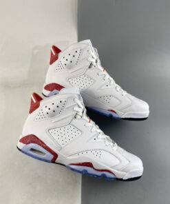 Dressed in a White, University Red, and Black color scheme. This Air Jordan 6 features a White leather base Red contrasting accents throughout. White speckling on the tongues, heel pull tabs, lace locks and midsole atop an icy translucent outsole completes the design.