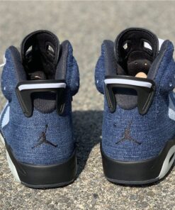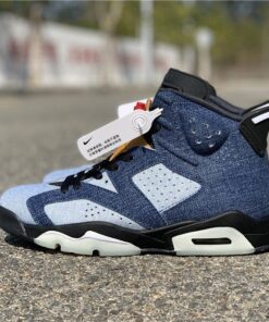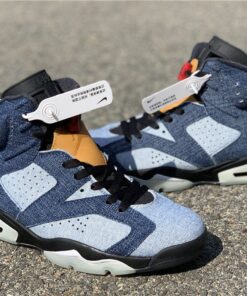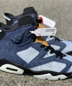Dressed in a Washed Denim, Sail, Varsity Red, and Black color scheme. This Air Jordan 6 features a washed denim upper, Tan leather on the tongue with a Red lace lock. A Black midsole atop milky translucent outsole will complete the design.