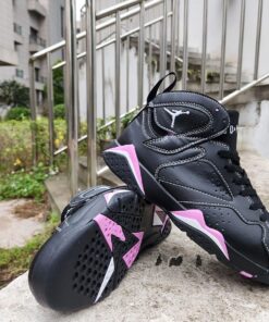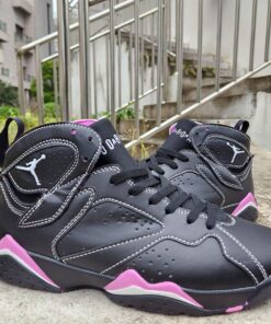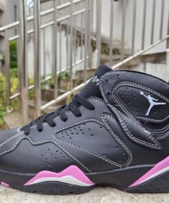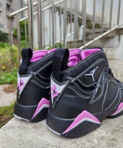 This smaller-sized high-cut AJ7 has a “Black/ Barely Grape/ Rush Fuchsia” colour arrangement. This offering of the Air Jordan 7 comes constructed in a Black leather base with exposed stitching throughout highlighted with Grape and Fuchsia contrasting accents. Contrasting exposed stitching in Rush Fuchsia line all the overlays. The embroidered Jumpman logos on the lateral collars and insoles are in Barely Grape. The plush sock liner and tongue lining and the geometrical midsole accents also follow suit. A black sole unit finishes off the look of these kicks.
