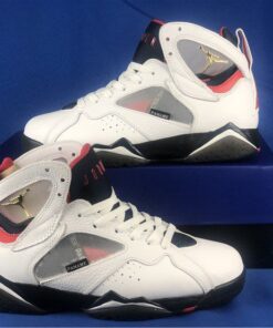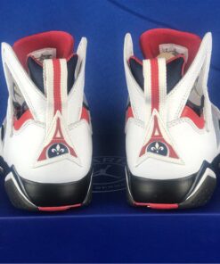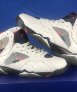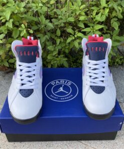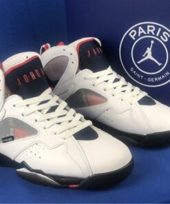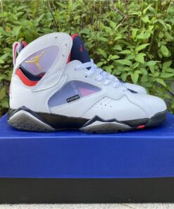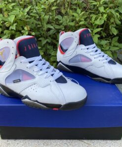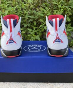 The shoes are decorated in full Parisian flavor, with white, red, navy, and gold dotting its surrounds while loosely nodding to the famed Olympic colorway. On the heel, replacing the “23” placement on standard AJ7s, is a fleur-de-lis as well as a visage of the Eiffel Tower. Finally, the familiar test of “PANAME” and “ICI C’EST PARIS” can be seen on the insoles and exterior flaps. Custom shoeboxes will also be part of the full package.
