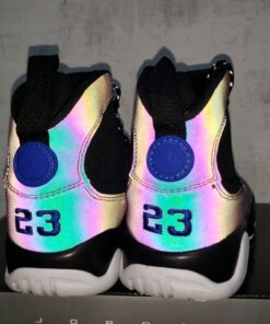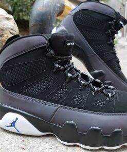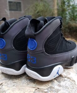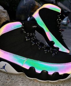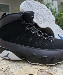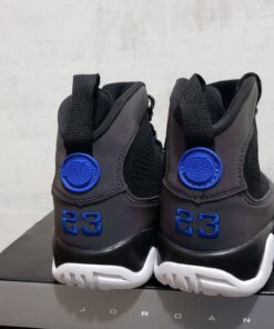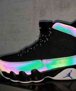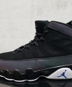 Dressed in a Black, White, and Racer Blue color scheme. This Air Jordan 9 features a Black nubuck upper with matching Black midsole, liner, and heel pull tabs atop a White rubber outsole. Highlighting the shoe are 3M reflective iridescent trimming and Blue accents on the branded areas.