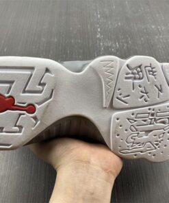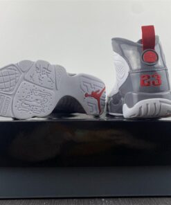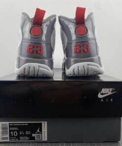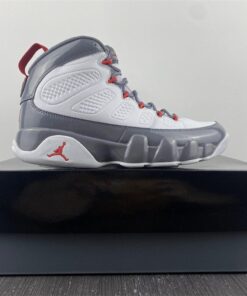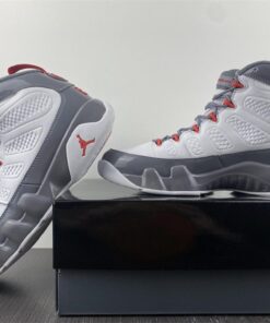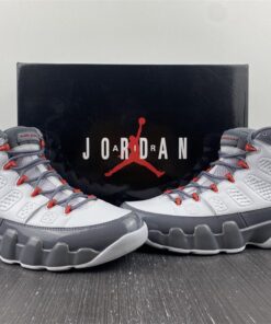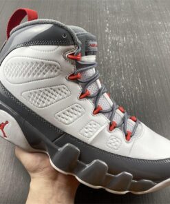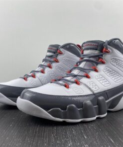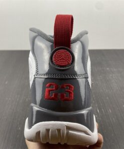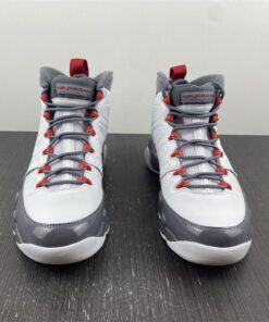 The sneaker uses a white leather base with Cool Grey overlays. The signature Fire Red hue appears on the lace loops, Jumpman, and 23 branding on the heel and tongue tag. The midsole is seen in grey, with a white outsole finishing off the sneaker.