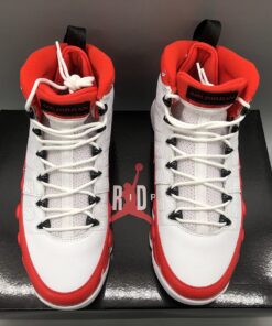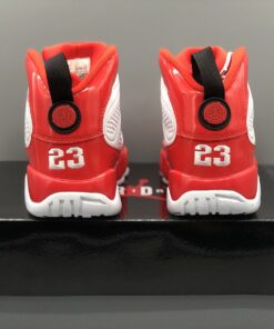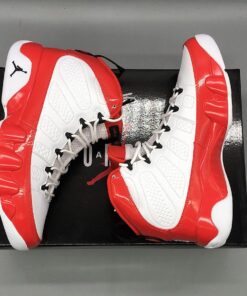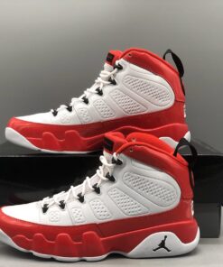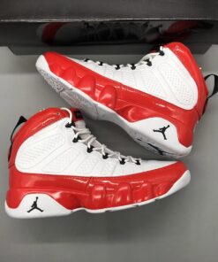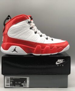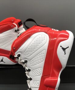 Dressed in a White, Gym Red, and Black color scheme. This Air Jordan 9 features a White leather upper with Red patent leather overlays. Black detailing appears on the eyelets, tongue, back pull tab, and Jumpman branding atop a White rubber sole.