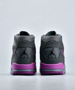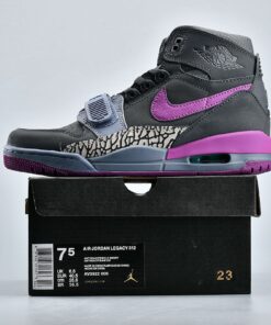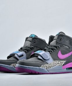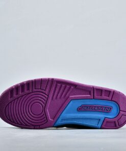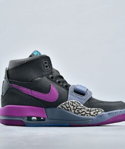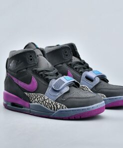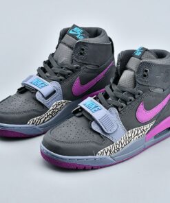 This offering sports a Dark Grey upper paired with Purple contrasting accents and a pebbled leather Swoosh logo on the sides. A light Grey/Slate Blue hue is used on the midfoot strap and midsole completed with a brighter Blue tone on the tongues, strap branding and outsole.