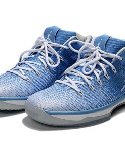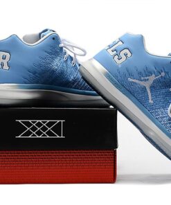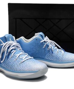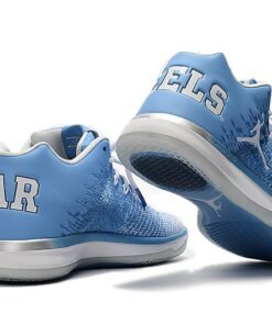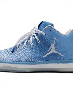 Dressed in a University Blue, White, and College Navy color scheme. This low-top Air Jordan XXX1 is highlighted with “TAR” and “HEELS” on the heels sitting atop translucent outsole.