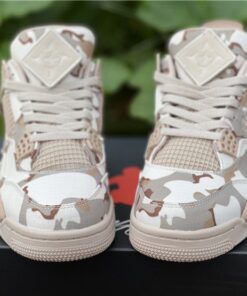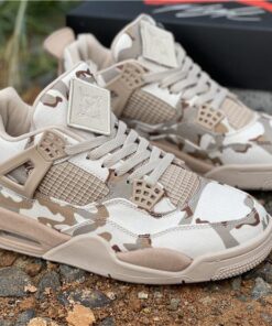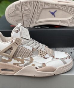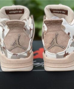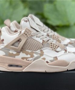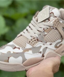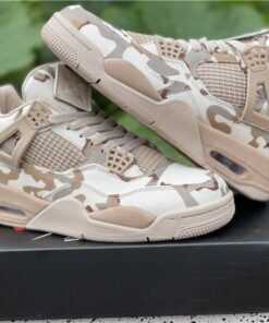 The upper of the sneaker features a desert camo with tan netting and wings. Tan suede is utilized on the heeltab and parts of the midsole with the tongue featuring a removable velcro patch.