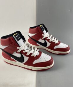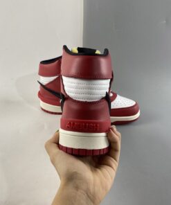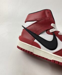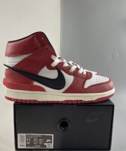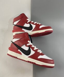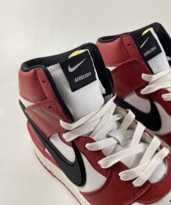 This offering of Ambush’s Nike Dunk High sports the popular “Chicago” color blocking. It features a White leather upper with Red leather overlays and her signature Swooshes in Black extending beyond the heel. Black tongue labels and inner lining atop a Sail midsole and Red rubber outsole completes the design.