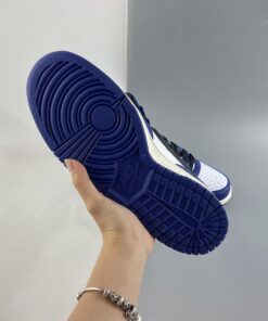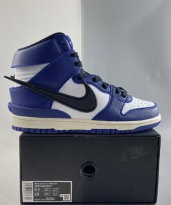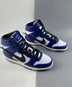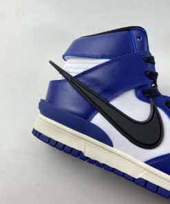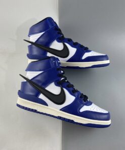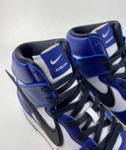 Dressed in a Deep Royal Blue, White, Pale Ivory, and Black color scheme. No leaked photos have surfaced, but you can likely expect this Nike Dunk High to feature a White leather upper with Royal Blue leather overlays and Black Swooshes extending beyond the heel.