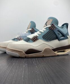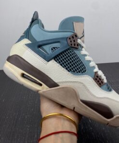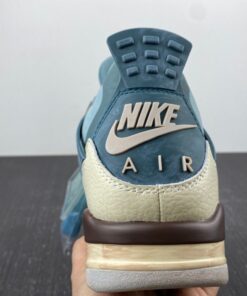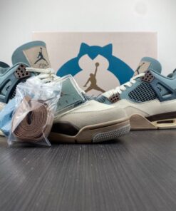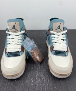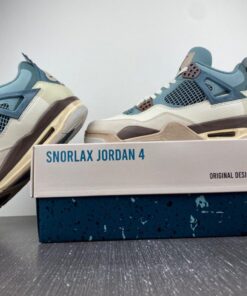The uppers found on the Air Jordan 4 “Snorlax Custom” is divided into top and bottom sections expressing tones of blue and beige. Darker patches of the colors offer a 3D effect drawn from the shadows found on the rotund shape of Snorlax. Elevating the shoe are brown Air-assisted midsoles and beige/gray rubber outsoles that replicate the look of the feet found on the Pokémon.