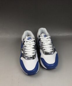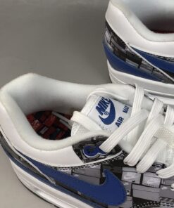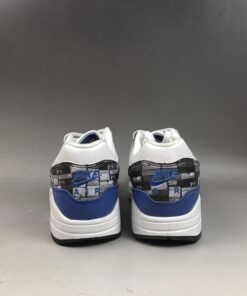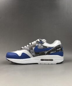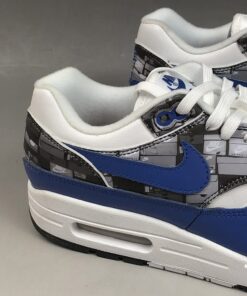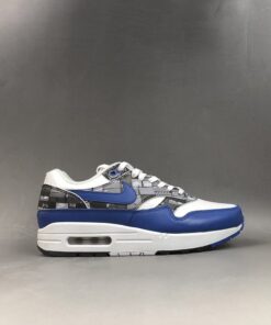 Dressed in a White, Game Royal and Neutral Grey color scheme. This Nike Air Max 1 is highlighted with a print that’s inspired by the typical sneakerhead’s room. It features Royal Blue leather overlays, White midsole and tri-colored rubber outsole.