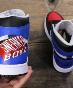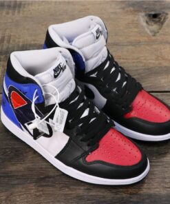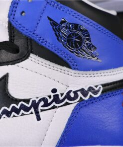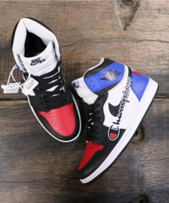 Introducing the limited edition Champions x Air Jordan 1 Custom sneakers in a sleek black, white, red, and blue colorway. These unique kicks are a must-have for any sneakerhead looking to stand out from the crowd. With premium materials and expert craftsmanship, these custom sneakers are sure to turn heads wherever you go. Don’t miss your chance to own a piece of sneaker history – get your pair today!
