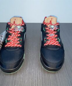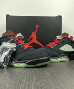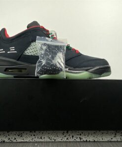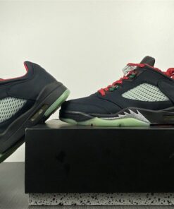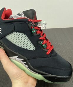 This low-top Air Jordan 5 by Clot features an interesting colorway while using Black suede across the upper. Next, Red accents run throughout while 3M reflective adorns the tongue and Silver hits the shark teeth on the midsole. Clot’s branding appears on the heel, Green covers the translucent lace lock, mesh netting, and outsole. Lastly, we have what appears to be a bungee cord with Green jewels running down the eyelets to finish the look.