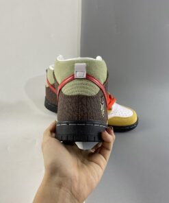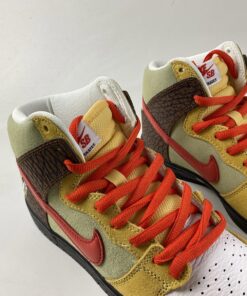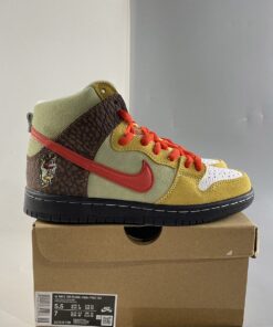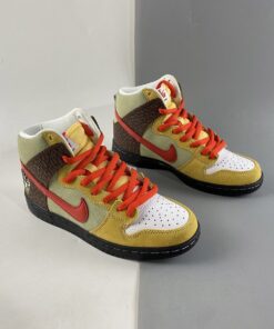 This offering of the Nike SB Dunk High features a Tan suede base to represent the pita paired with Red laces and Swooshes as a nod to tomatoes, and a White toe box resembling the famous tzatziki sauce. Other details includes Brown elephant print at the heel used as the meat component with gyro graphics on the medial side and insoles finished with kebab and destroy” tag on the inner tongue.