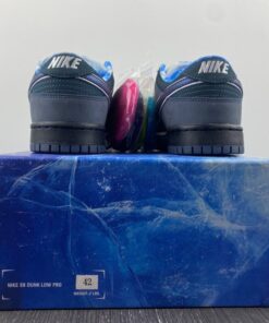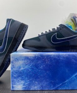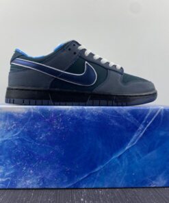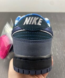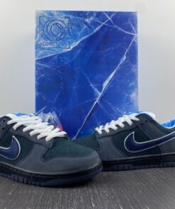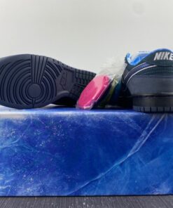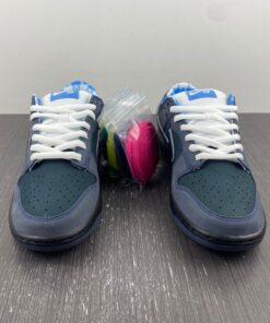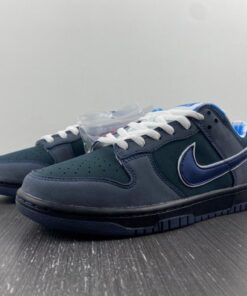 Dressed in a Nightshade and Dark Slate color scheme. This Nike SB Dunk Low features a Nightshade leather base with speckled Dark Slate overlays. Special details include a Blue and White plaid pattern on the lining and an elastic band wrapped around the forefoot—a nod to the traditional safety measure used to secure lobster claws.