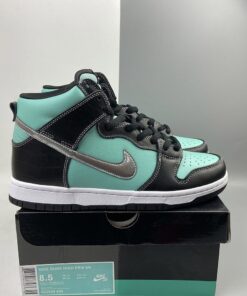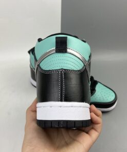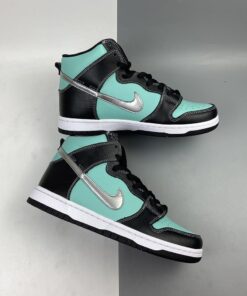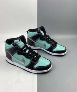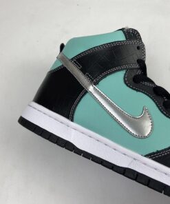 This offering of the Nike SB Dunk High features the same colorway as the Diamond Supply’s SB Dunk Low from Nike SB’s 2005 Team Manager series. It comes with an Aqua leather upper paired with Black faux croc skin overlays and Chrome Swooshes on the side panels. A White midsole atop a Black rubber outsole completes the design.