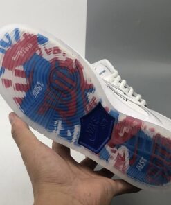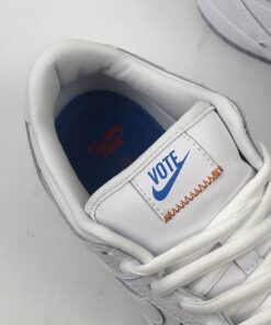 From a design standpoint, the shoe’s upper is constructed of tumbled white leather with a midfoot Swoosh that originates in a black rectangular box — a clever nod to checking off one’s ballot. There’s also a red fabric “Vote” tag hanging from this Swoosh under the collar, and the heel’s Staple Pigeon graphic is sporting an Uncle Sam-style red, white and blue hat. Unique markings appear on the tongue and heel alike, with the former featuring a hybrid Nike Swoosh/Vote graphic and the latter spelling out “SRGN.” Insoles feature an all-over red, white and blue print inspired by voting stickers. This collage is replicated under the translucent outsole, and for a final pop of detailing the shoes arrive with a special “Vote” hangtag.