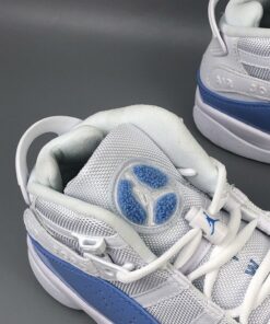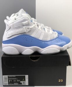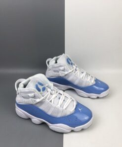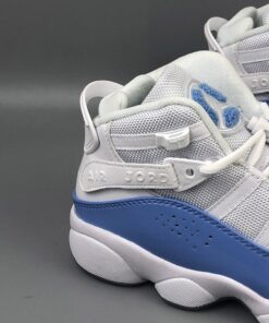 Dressed in a White, Valor Blue, and Ice color scheme. This Jordan 6 Rings features a White mesh and leather upper paired with a Carolina Blue patent leather mudguard. An icy translucent outsole completes the design.