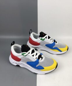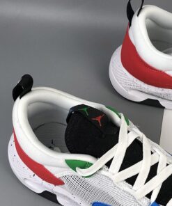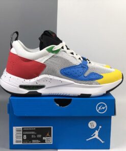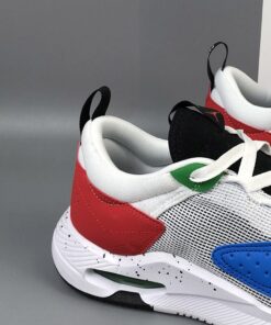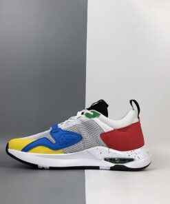 This latest offering of the shoe was originally meant to celebrate the 2020 Olympics as it comes with Blue, Yellow, Black, Green, and Red tones nodding to the Olympics ring logo. A White mesh upper with multicolored Jumpmans on the tongue atop a speckled midsole completes the design.