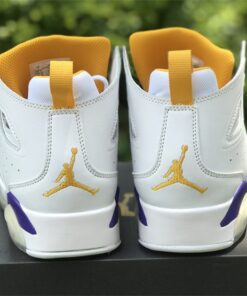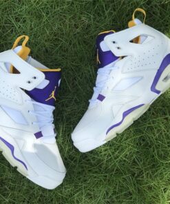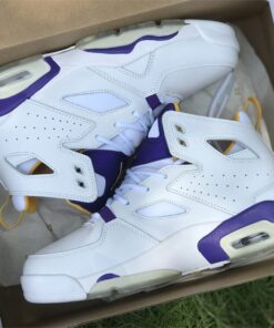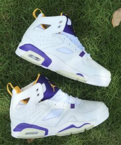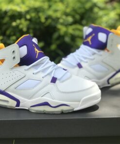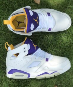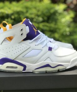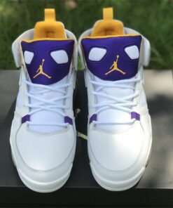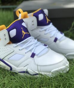 The Jordan Flight Club 91 Lakers comes dressed in a White, Court Purple, and University Gold color scheme. The White upper is constructed in a mix of genuine and synthetic leather paired up with the model’s signature inner bootie. The White upper is then offset by the Court Purple and University Gold hits noted throughout, including the heel pull tab, parts of the midsole, tongue and branding.