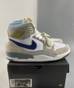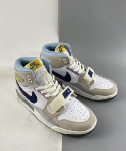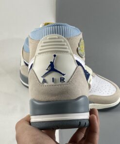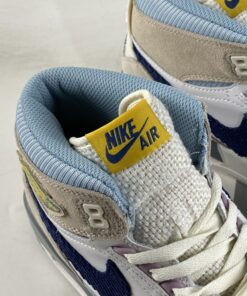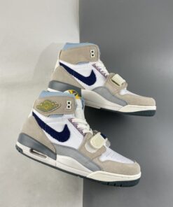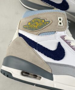 The bright white leather base is but only a small factor here, with a bevy of material overlays coming in to cover the release, From warm beige suedes at the toe, heel, and ankle flaps, to grey canvas mudguards and blue corduroy checks, the pair is a bonafide smorgasbord of textile. But wait — there’s more! Crochet-like tongues, fleece Wings motifs, and ribbed collars complete the material makeup in hues of cream, gold, and steel blue respectively. Plastics at the eyestays and forefoot strap usher in light mauves and creams, whilst branding at the vamp and heel come colored in blue. Underfoot is relatively simple in comparison, with muted blue-grey hues highlighting a sail midsole to complete the design.