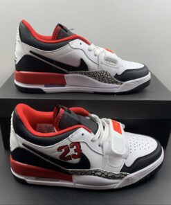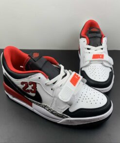 Jordan Legacy 312 Low 23 White Black Red sneakers live up to their titular mission as legacy kicks. This pair is updated in Chicago Bulls colours, with white serving as the base for the leather upper. what’s most striking is the “23” printed onto the lateral side.Contrasting accents come in via the black mudguard, Swoosh, collar and lateral overlay, as well as the red tongue trim, lining and lateral midsole. The style’s numericals hit just above the Swoosh, while an elephant-printed insert lands underneath it. On the comfort front, you get generously a padded collar as well as supreme cushioning via the exposed Air unit.