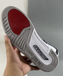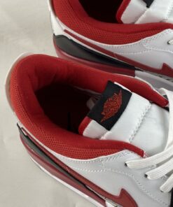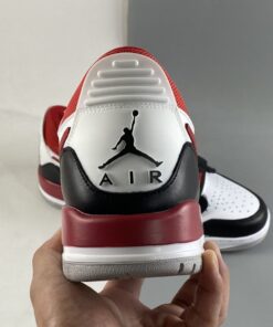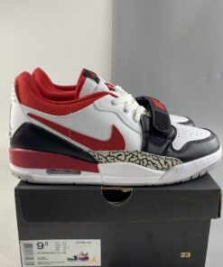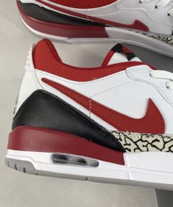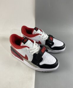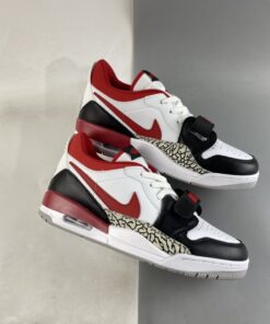 This offering of the low-top Jordan Legacy 312 comes constructed in a mix of leather and mesh with signature nylon tongues. It features a White base with Black overlays on the toe, Red Swooshes, collars, lining, and rear end of the midsole. Signature elephant print, lower strap atop a Grey rubber outsole completes the design.