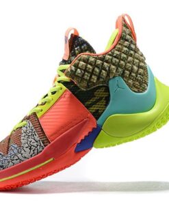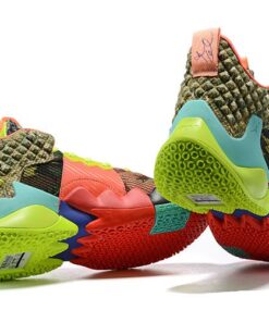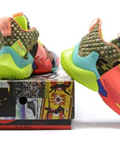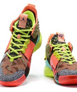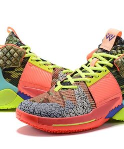Dressed in a Camo Green, Hyper Turquoise, Volt, and Infrared color scheme. This basketball silhouette blends bright colors with bold patterns to ensure that Russell Westbrook will stand-out during All-Star Weekend.
