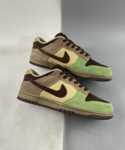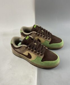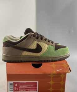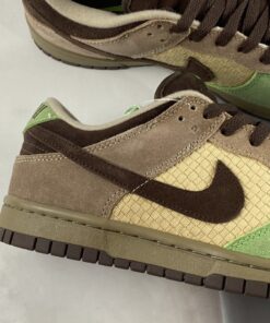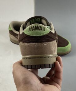 the creative mind behind the KICKS/HI label, was given the opportunity to represent the culture and scenery of their home state. The result was clearly representative of the laid-back style of luaus and beach-front parties, with the green/brown/beige colorway and weaved ‘Lauhala’ bamboo mid-panel. One of the more unique features of this Dunk Low seen in a very small amount of other releases is that the tongue label as well as the stitched embroidery on the heel have been switched from the customary Nike label to ‘ALOHA’ on the tongue and ‘HAWAII’ on the heel-tabs. T