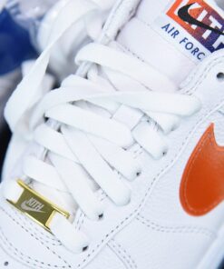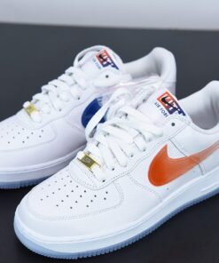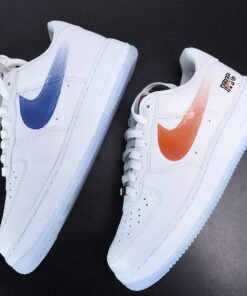 One pair comes dressed in “Black/Team Orange-Black-Rush Blue” and the other sports a “White/Rush Blue-White-Brilliant Orange” makeup. Both feature Black and White leather uppers with mismatched semi-translucent TPU Swoosh logos, Kith branding on the tongue tags, rear “NYC” embroidery, Metallic Gold dubraes atop a White midsole and icy translucent outsole.