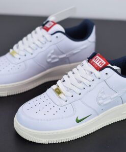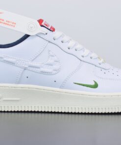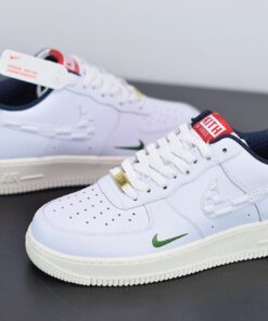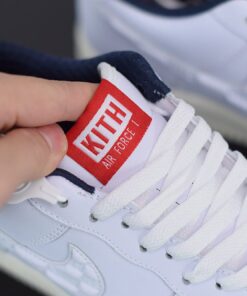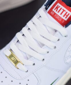 Dressed in a White, University Red, and Metallic Gold color scheme. This Air Force 1 features a White leather upper, debossed “KITH” branding into the Swoosh, Green mini Swoosh logos, Navy inner lining, and Gold lace tips and lace dubrae. Finishing off the design is a Red Kith box-logo at the tongue.
