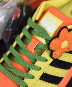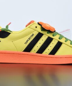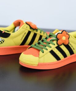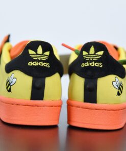 Joining this is the Superstar in “Yellow/Core Black/Super Orange.” This pair offers everything you’d expect to find in the playful world of a bumblebee — from a flower patch on the tongue to a flower print that overlaps from the tongue and onto the Shell Toe. A black and yellow colorway nods to the bee once more, as does the bee embroidery on the heel. Finally, a fuzzy heel tab and a small rubber spike at the rear complete this buzzy look.