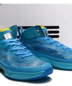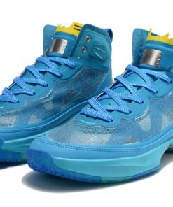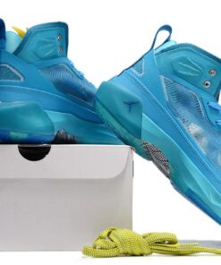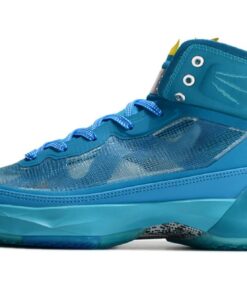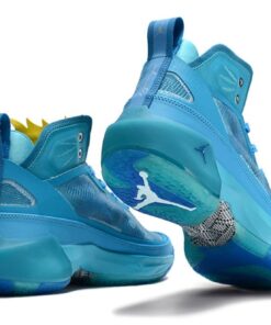 the Naruto x Zion Williamson x Air Jordan 37 have just been revealed, featuring a lush blue monochromatic upper and spiky yellow on the tongue — presumably mimicking Naruto’s hair. Claw marks appear embroidered on the ankle pads, while the tongue feature metallic silver plating akin to the forehead protectors. Naruto’s catchphrase “だってばよ!” appears on both tongues (the right translated to English), while his Rasengan chakra orb is placed on the insoles.