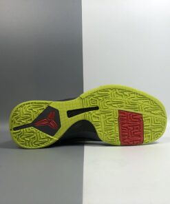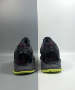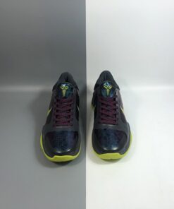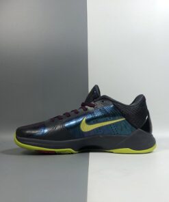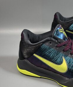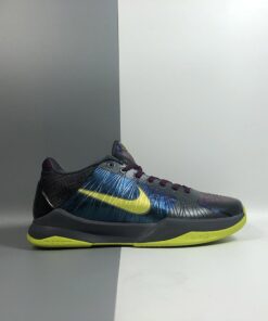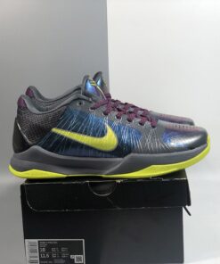 This rendition of the “Chaos” Kobe 5 Protro comes dressed in the same Joker-themed colors with iridescent panels and replaces the White overlays with a Charcoal snakeskin fabric. A darker shade of Grey is also added to its midsole, which is different from the original.