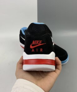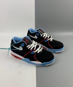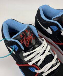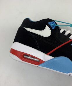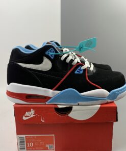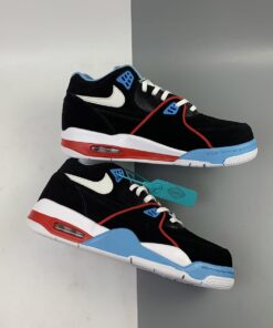 This edition of the Air Flight 89 sports a Black suede, mesh, and leather upper contrasted with Light Blue and Red contrasting accents throughout. White leather Swooshes, laces, midsole and rubber outsole completes the design.