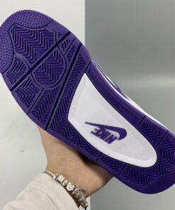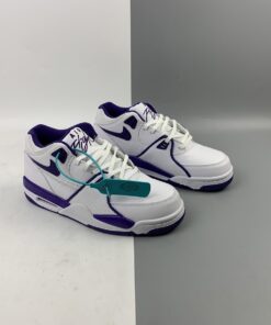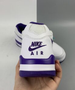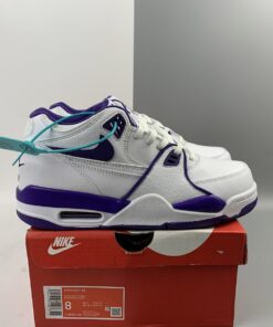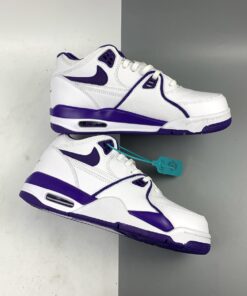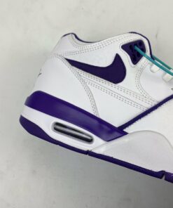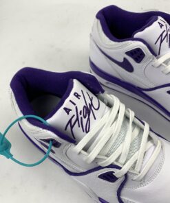 This offering of the Nike Air Flight 89 features a White leather upper with mesh around the collar and croc-like skin on the lower panel. Highlighting the shoe are Purple accents atop a matching colored rubber sole.