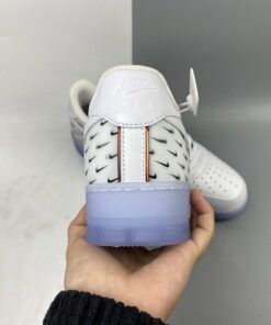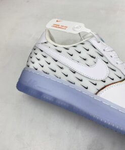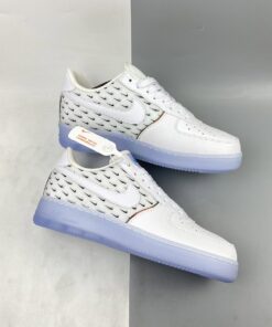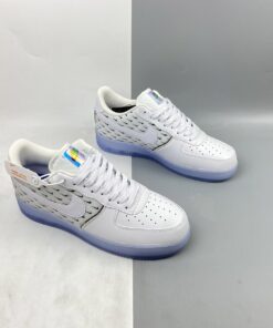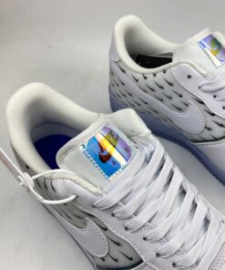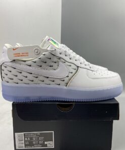 This Nike Air Force 1 comes dressed in a White, Multi-Color, and Racer Blue color combination. First, the pair comes with White on the base along with holographic detailing. We also have stitched overlays and multiple mini Swoosh logos across the panels that expand across the heel. Finally, an icy midsole and matching rubber outsole finish the look.