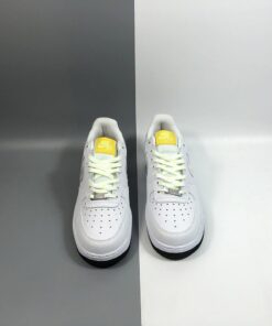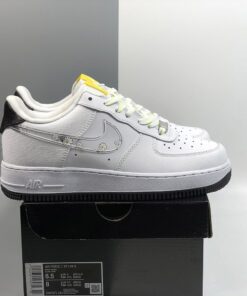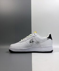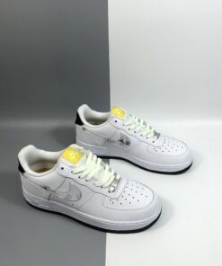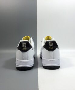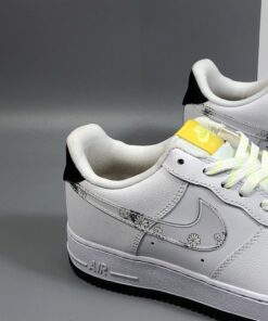 The Nike Air Force 1 keeps things more simple featuring a White leather upper with a translucent Swoosh revealing floral graphics. Black covers the heels and rubber outsole with Yellow tongue tags and Volt-striped laces. Both are completed with daisy icons spotted throughout each model.