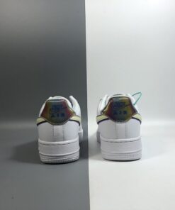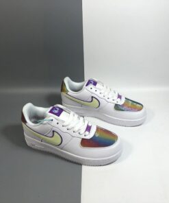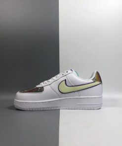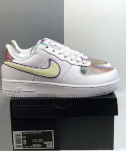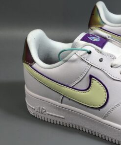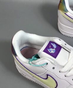 Dressed in a White, Barely Volt, and Hyper Blue color scheme. This Nike Air Force 1 Low features a White leather upper with Blue outlining the Volt Swoosh logos on the sides. Iridescent detailing on the toe and heel completed with cracked egg logos on the tongues and insoles.