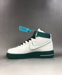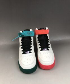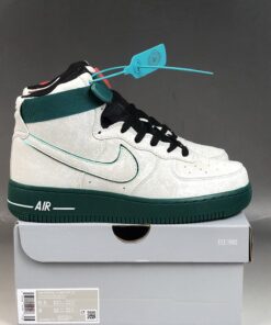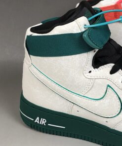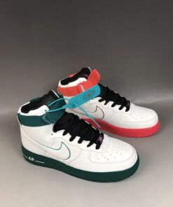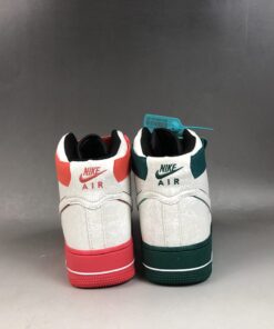 Looking closer this Nike Air Force 1 High features a mismatch theme while White leather covers the entire upper. In addition they feature accents of Red and Green on the left and right shoe. In addition we have lace dubraes, special tongue branding and a graphic on the insoles. This look represents the Hoop Culture in China during the early 2000s.