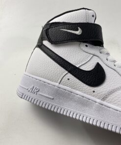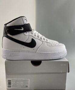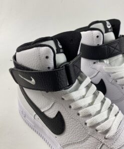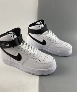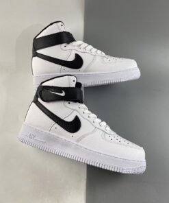 One of those comes dressed in a classic White and Black makeup. This Nike Air Force 1 High features a White tumbled leather upper with perforations on the toe box and side panels. Black covers the ankle strap, tumbled leather Swooshes, heels, liners, and insoles completed with White branding on the tongue tags, heels, and insoles atop a signature White AF1 rubber sole.