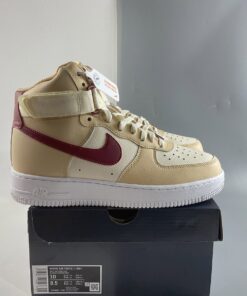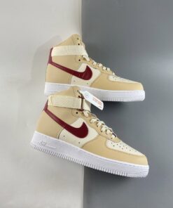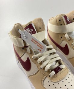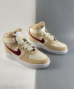 This Nike Air Force 1 High features a White Onyx, Noble Red, and Pale Ivory color combination. First, we have a mixture of tumbled and smooth leather throughout while Sail lands on the panels. Next, Grey adorns the toe box, Beige lands on the overlays while Red hits the Swoosh logos, tongue labels, and heel. Lastly, a White midsole and matching rubber outsole finishes the look.