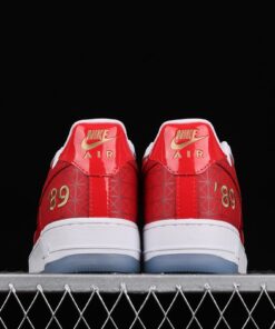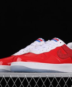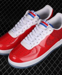 Dressed in the classic Detroit Pistons colors of Red, White, and Blue, with added Gold detailing for the occasion. This Nike Air Force 1 Low features a Red patent leather upper with a debossed pattern on the Red leather Swoosh and heel. The year ’89 is embroidered on the heel with Pistons-style details on the tongues completed with “The D” and “Just Do It” in the classic Finals font. A White midsole atop an icy translucent outsole completes the design.