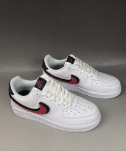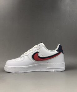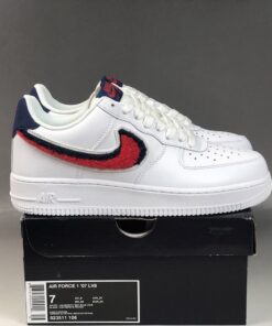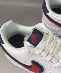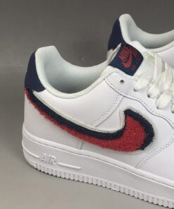 with everything from the Blazer Low to the Air Force 1 High donning the unique branding. The Swoosh isn’t done with the design yet though, as now the Air Force 1 Low is the latest classic silhouette to receive the retro-futuristic treatment. Arriving in a patriotic red, white, and blue color scheme, the shoe features a clean and classic white leather upper with detail arriving via a blue/red tongue tag and heel tab. However, the shoe’s most unique feature arrives via the aforementioned large chenille swoosh: featuring a layered red/blue/white chenille material and bold black stitching that provides an interesting optical illusion